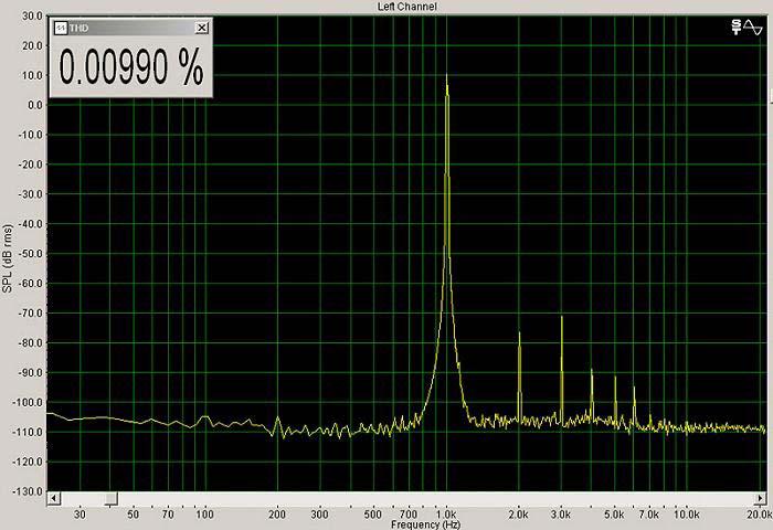 在此項(xiàng)測試時,我們會從待測物輸出一個0dB 48KHz Sample Rate 1KHz 的聲音然后輸入到儀器去分析。之后調(diào)整計(jì)算機(jī)的音量到最大,看是否有諧波失真(有關(guān)諧波失真后述),接著放低音量到諧波失真率低于0.2后,顯示在屏幕上的電壓值即為此產(chǎn)品的Full Scale,此值必須記錄下來,后續(xù)的測試都會用到。