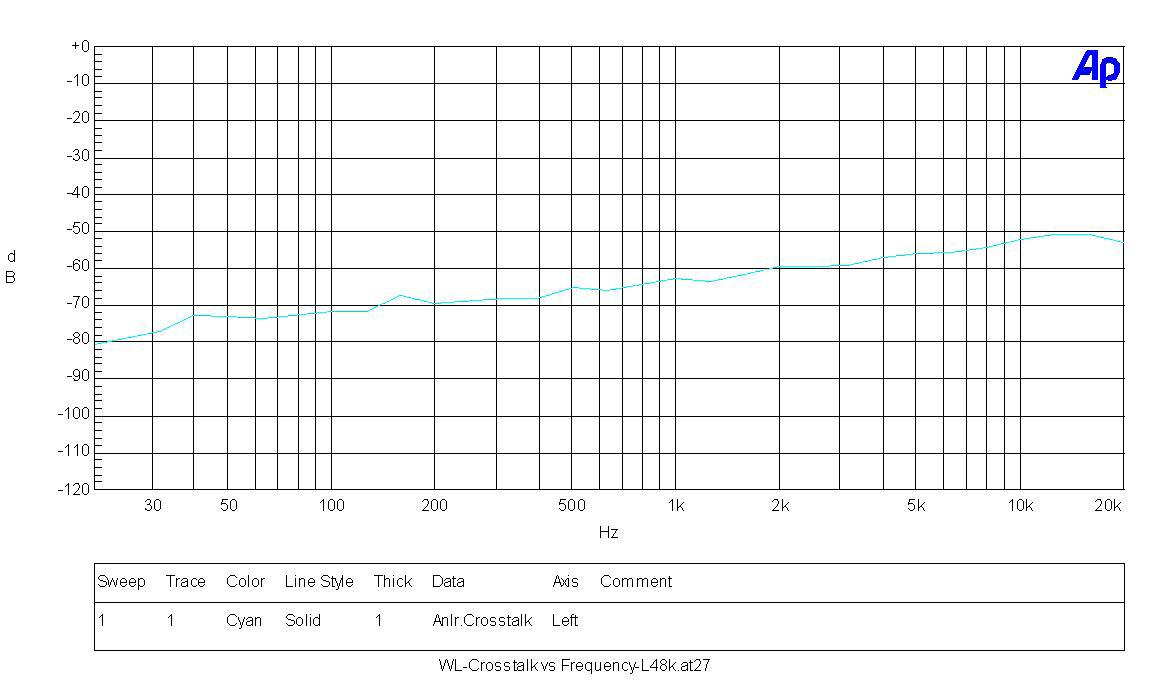 為了此項(xiàng)測試,我們應(yīng)該準(zhǔn)備二個不同的Mono檔案,一個是全頻31階-20dB但只有左聲道,另一個則只有右聲道,當(dāng)在測量時,儀器本身的Cross-talk測試功能會去檢查有聲音的那個聲道,和另一個沒聲音的聲道彼此之間的差異,而取得的比值就是我們要的Cross-talk值。因此本測試需要跑二次,一次是左聲道對比上右聲道,另一次則相反。