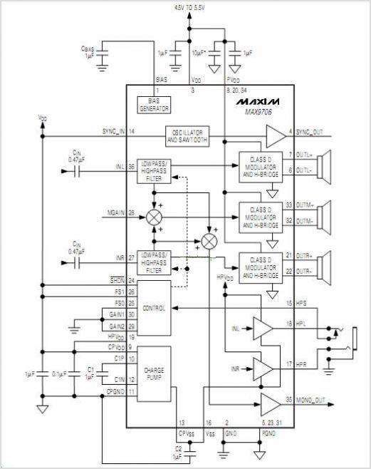內(nèi)部有源濾波器處理立體聲輸入(左聲道和右聲道),送至立體聲高通和單聲道低通輸出。交叉開關(guān)頻率由引腳選擇為4個(gè)不同頻率,以適應(yīng)多種揚(yáng)聲器配置。內(nèi)置D類放大器具有低EMI擴(kuò)頻輸出。無需輸出濾波器。