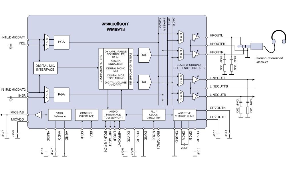 WM8918以立體聲接地參考耳機(jī)放大器為特色,它采用了歐勝W類放大器和一個(gè)創(chuàng)新的雙模電荷泵架構(gòu)來改善回放期間的效能和功耗,通過去除了對交流耦合電容器的需求來減少電路板的面積、原料成本以及改善低音響應(yīng)。
