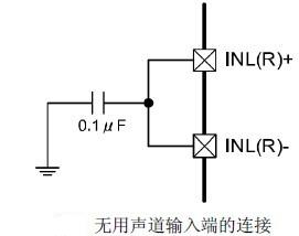 另外,若輸入端(INL+和INL-,或者INR+和INR-)沒有接音源輸入,應將沒有用到的通道的兩個輸入端短接,并通過一個電容連接到地,見圖3。該電容值與上面所述隔直電容值相同(0.1uF)