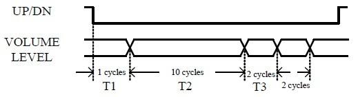 將UP或DN管腳置低電平可實現(xiàn)音量上升或下降,控制時序如圖4所示。其中T1為抗抖動時間,經(jīng)過T1后音量上升或下降一階;T2為音量維持不變的時間,經(jīng)過較長時間T2后音量繼續(xù)上升或下降一階;此后每隔較短時間T3,
