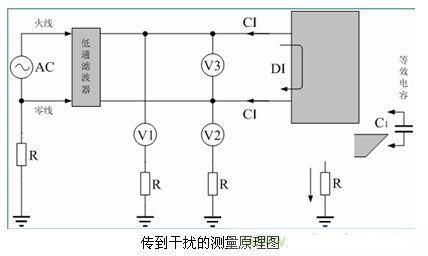 如圖所示,其中CI為共模干擾、DI為差模干擾、V1 = CI DI 、V2 = CI + DI 、V3 = DI ,R1、R2、R3、R4為接地電阻,C1為分布電容。