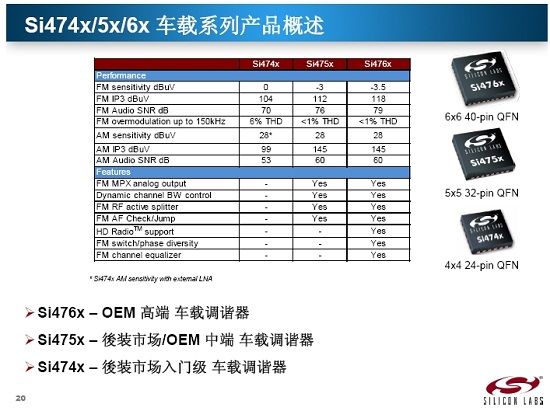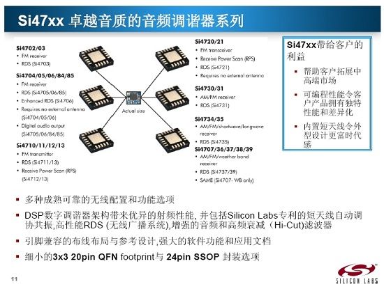 Silicon Labs針對收音機市場擁有三條產(chǎn)品線,分別是:針對消費類輪調(diào)收音機市場的Si48xx系列;針對消費類數(shù)調(diào)收音機市場的Si470x/1x/2x/3x系列;以及針對車載類收音機市場的Si474x/5x/6x系列。