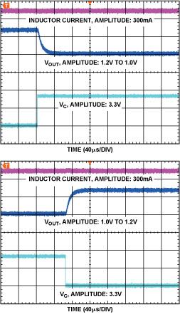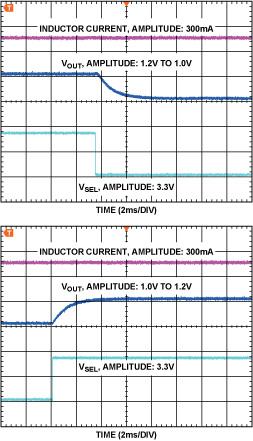 圖4示出了輸出電流IOUT、輸出電壓VOUT和控制電壓VSEL。VSEL為低電平時(shí),輸出電壓為1.0 V,VSEL為高電平時(shí),輸出電壓為1.2 V。