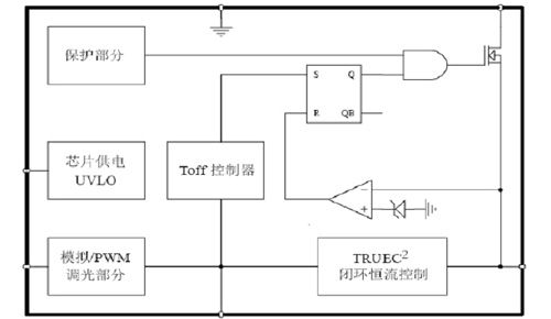所謂開環(huán),不以檢測到的輸出電流值來做發(fā)出PWM信號的參考。所謂的閉環(huán),即真正檢測輸出電流值,以此為標(biāo)準(zhǔn)來發(fā)出PWM信號。從電路拓?fù)渖,二者沒有區(qū)別。但是在芯片內(nèi)部對檢測到的如圖1 CS腳電感電流信號,做專利技術(shù)處理,如圖2 TRUEC2部分。這樣,就檢測到了電感電流的平均值,也就是輸出電流的平均值。芯片針對檢測到的值,控制輸出占空比,實(shí)現(xiàn)了閉環(huán)控制。