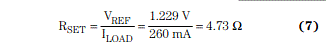 升壓轉(zhuǎn)換器經(jīng)過配置,用于驅(qū)動3支高亮度白光LED(260 mA)。典型參考電壓為1.229 V時,將簡化的負(fù)載電流用于方程式7中,計算得到RSET: