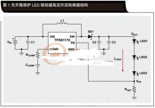 我們常常對轉(zhuǎn)換器進(jìn)行修改,以在單節(jié)鋰離子(Li-Ion)、堿性及其它應(yīng)用中驅(qū)動高亮度LED。在這些應(yīng)用中,LED串的電壓超出了電池或者電源軌電壓。在標(biāo)準(zhǔn)升壓圖1無開路保護(hù)LED驅(qū)動器高壓升壓轉(zhuǎn)換器結(jié)構(gòu)配置結(jié)構(gòu)中,利用一個分壓器產(chǎn)生電路的反饋電壓VFB,從而對輸出電壓VOUT進(jìn)行監(jiān)控。轉(zhuǎn)換器對輸出電壓進(jìn)行調(diào)節(jié),讓VFB始終都等于片上參考電壓VREF.這種拓?fù)錇樽赃m應(yīng)型,可用負(fù)載代替反饋分壓器中的上層電阻器,從而保持恒定電流而非恒定電壓,如圖1中LED串所示。