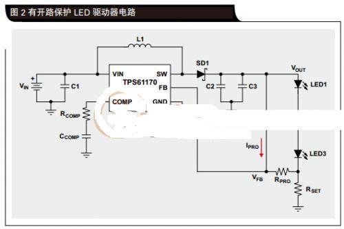 我們?yōu)辇R納二極管選擇一個電壓,以使正常電路工作期間沒有電流流經(jīng)它。為了確保該二極管在正常運行期間圖2有開路保護(hù)LED驅(qū)動器電路完全關(guān)閉,所選電壓應(yīng)至少高于最大負(fù)載電壓2V,但小于升壓轉(zhuǎn)換器的規(guī)定最大輸出電壓。這樣,電路設(shè)計人員便不會經(jīng)常被迫增加輸出電容器C2和C3以及箝位二極管SD1的額定電壓。