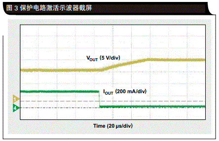 圖3保護(hù)電路激活示波器截屏作為一個應(yīng)用舉例,TI TPS61170升壓轉(zhuǎn)換器IC被配置為一個恒定電流LED驅(qū)動器。在諸如背光照明或者手電筒等應(yīng)用中,它是驅(qū)動高亮度LED串的理想升壓轉(zhuǎn)換器。3V-18V輸入范圍允許使用較寬的電源范圍,例如:2S到4S鋰離子或者3S到12S堿性電池組、USB或者12V電源軌。