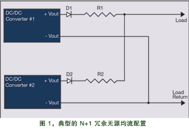 采用無源均流的其它原因還包括:提高 N+1 電源模塊配置的可靠性,保證沒有使用中間電壓總線和負(fù)載點(diǎn)轉(zhuǎn)換器的電路板的更好性能。如果電路板包含了配送很寬的負(fù)載,通過使轉(zhuǎn)換器盡可能接近負(fù)載將可以取得較好的調(diào)壓效果——也許使用電路板的兩面——并且由于電路板線徑將傳送更少電流,因此可以減少銅芯的數(shù)量。