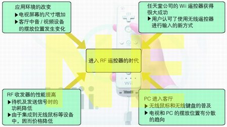 首先,客廳中電視的使用狀況發(fā)生了變化;其次,任天堂公司的家庭游戲機(jī)Wii所采用的RF遙控器獲得了很大成功;再次,可以聯(lián)網(wǎng)的電視逐漸普及,市場(chǎng)對(duì)于鼠標(biāo)或鍵盤(pán)等輸入設(shè)備的需求量增加;最后,用于RF遙控器的無(wú)線(xiàn)收發(fā)器的性能迅速提升。這些變化導(dǎo)致RF遙控器走向?qū)嵱谩?/font>