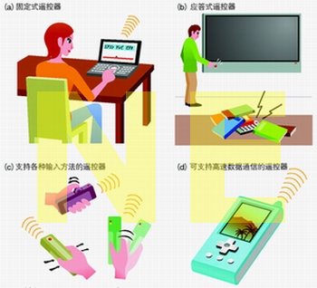 而且,在使用RF的情況下,將有可能在短距離內(nèi)實(shí)現(xiàn)遠(yuǎn)優(yōu)于紅外線(xiàn)性能的高速數(shù)據(jù)通信。把數(shù)據(jù)廣播的內(nèi)容發(fā)送到遙控器中的應(yīng)用也在考慮之中;蛘,如果是集成了藍(lán)牙功能的手機(jī),也可以利用藍(lán)牙無(wú)線(xiàn)功能,將手機(jī)當(dāng)作遙控器使用。