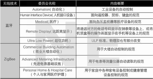所謂下一代遙控器,以電視使用的RF遙控器為例,就是用于控制立體聲設(shè)備、手表、照明燈具、空調(diào)、門(mén)口的監(jiān)視攝像頭或警報(bào)器等家庭安全設(shè)備和醫(yī)療設(shè)備的遙控器?梢哉f(shuō),遙控器可以實(shí)現(xiàn)整個(gè)家庭的自動(dòng)控制。ZigBee和藍(lán)牙兩個(gè)陣營(yíng)都正在制定關(guān)于下一代遙控器的通信標(biāo)準(zhǔn)(見(jiàn)表4)。