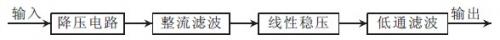 本設(shè)計由降壓模塊、整流濾波模塊、線性穩(wěn)壓模塊和低通濾波模塊組成,如圖1所示。變壓器將220 V/50 Hz交流電分別降壓到±16 V、±6 V、+6 V,通過整流橋堆整流以及大容量電容濾波后,進入正(負)線性穩(wěn)壓模塊,再經(jīng)過低通濾波模塊濾除直流以外的干擾信號,分別輸出±15 V、±5 V、+5 V的穩(wěn)定電壓。