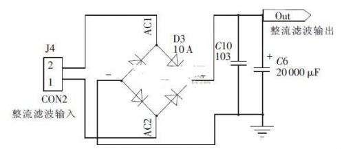 整流濾波電路主要由整流橋堆和大容量濾波電容組成,如圖2所示。整流橋堆具有體積小巧、輸出電流大、安裝方便等優(yōu)勢,并能代替由4只二極管組成的傳統(tǒng)橋式整流電路。濾波電路采用大容量電解電容濾波,增加了輸出電壓的穩(wěn)定性。根據(jù)式(1)可求出所需濾波電容容量。