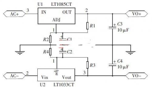 LT1083/LT1033系列正負可調(diào)穩(wěn)壓器的效率大大高于現(xiàn)有器件,可以提供7.5 A、5 A和3 A輸出電流,并能在低至1 V的壓差條件下運行,壓降在最大電流條件下保證在1.5 V以內(nèi)。負載電流減小時允許壓差同時減小,可在多種電流水平條件下通過片內(nèi)修整電路,提供所保證的最小壓差,并能夠使輸出電壓準確度調(diào)節(jié)至1%.其電壓調(diào)整率為0.015%,負載調(diào)整率為0.01%,對電流限值也進行了修整,最大限度地減小了過載條件下穩(wěn)壓器和電源電路上承受的應(yīng)力,具有熱功耗限制保護[10].LT1083/LT1033系列器件的引腳與老式三端穩(wěn)壓器兼容,與大多數(shù)穩(wěn)壓器設(shè)計中的10μF輸出電容器以及PNP穩(wěn)壓器多達10%的輸出電流作為靜態(tài)電流消耗不同,LT1083/LT1033系列的靜態(tài)電流流入負載,大大降低了電源功耗。此芯片電壓調(diào)整率小、負載調(diào)整率小的特點能夠保證輸出電壓穩(wěn)定度高。正負線性穩(wěn)壓模塊電路如圖3所示,其中R1=R3,R2=R4.電路中的電阻參數(shù)可根據(jù)輸出可調(diào)電壓公式確定: