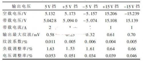 測試儀器采用固緯4位半數(shù)字萬用表(GDM-8245)、上海愛儀交流毫伏表(AS2294D)和調(diào)壓變壓器(TDGC -0.5/0.5) .負載電阻采用水泥電阻(2.5Ω/20 W、5Ω/20 W、15Ω/20 W) .電源性能參數(shù)如表1所示?梢钥闯,負載調(diào)整率和電壓調(diào)整率反映出了電源較高的穩(wěn)定度,紋波系數(shù)指標反映出低紋波特性。