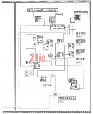 該幀首先由Read Characters From File VI函數(shù)讀出磁盤數(shù)據(jù)文件中的數(shù)據(jù)。由于讀出的是字符串,要經(jīng)Spreadsheet StringTo Arrary函數(shù)將其轉(zhuǎn)為三維數(shù)組,再經(jīng)兩個(gè)Delete From Array將三維分離為三個(gè)一維數(shù)組。將電流信息數(shù)據(jù)送人BuildWaveform生成波形,由Chart顯示。同時(shí)將該組數(shù)據(jù)經(jīng)NumericIntegration.vi求積分,得曲線下面積值,在輸出能量窗顯示充放電的安時(shí)數(shù)。