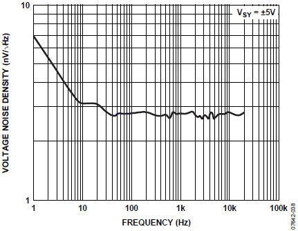 對(duì)于20kHz的帶寬,該乘數(shù)因子為141。舉ADA4075-2為例,其噪聲密度為2.8 nV/√Hz乘以141,因此噪聲電平為0.395μV或-128 dBV。運(yùn)算放大器的噪聲密度通常在數(shù)據(jù)手冊(cè)的典型特性部分的表格中顯示,且通常顯示其整個(gè)頻率范圍內(nèi)的曲線。該圖表可用于查看在何頻率下運(yùn)算放大器噪聲將取決于1/f噪聲。對(duì)于許多運(yùn)算放大器來(lái)說(shuō),這個(gè)點(diǎn)通常低于音頻頻帶(20Hz)低端,但是噪聲密度的曲線仍然值得一看,且不能僅參考噪聲密度指數(shù)來(lái)完全描述噪聲性能。圖1為ADA4075-2數(shù)據(jù)手冊(cè)中的噪聲密度圖實(shí)例。請(qǐng)注意圖1中1/f轉(zhuǎn)折點(diǎn)約為10Hz,遠(yuǎn)低于MEMS麥克風(fēng)前置放大器電路的目標(biāo)頻帶。