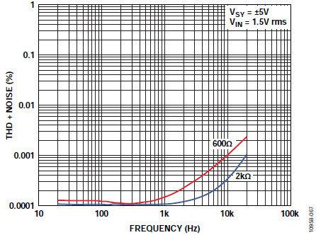 圖2. ADA4075-2 THD + N與頻率的關(guān)系