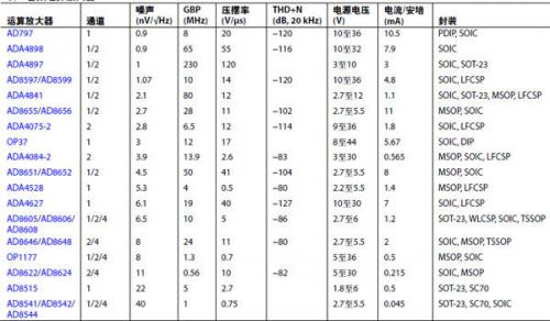 對(duì)于運(yùn)算放大器來(lái)說(shuō),比麥克風(fēng)更加低噪非常重要,因此從噪聲方面考慮,前置放大器電路要盡量的透明性。一個(gè)非常好的做法是運(yùn)算放大器的噪聲比麥克風(fēng)本身低至少10dB,以將其對(duì)于全局噪聲的影響最小化。為了使用ADMP504前置放大器實(shí)現(xiàn)該目的,運(yùn)算放大器的最高本底噪聲為-113 dBV或15.9 nV/√Hz。表1中的大部分運(yùn)算放大器都遠(yuǎn)低于該限值,其中不低于該限值的運(yùn)算放大器仍被列出因?yàn)樗鼈兙哂衅渌赡茉谀承┨厥庠O(shè)計(jì)中非常重要的參數(shù),例如用于低功耗設(shè)計(jì)的工作電流。請(qǐng)注意電路的總輸出噪聲電平將受所施加增益和電路中電阻的影響,而不僅僅取決于運(yùn)算放大器?梢酝ㄟ^(guò)選擇足夠小的電阻來(lái)使其對(duì)總電路噪聲的影響最小。
