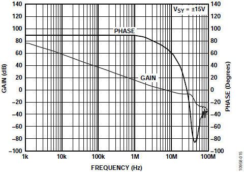 圖3. ADA4075-2開(kāi)環(huán)增益和相位與頻率的關(guān)系