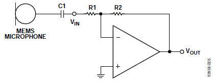 單個(gè)運(yùn)算放大器可以簡(jiǎn)單地作為MEMS麥克風(fēng)輸出的前置放大器應(yīng)用于電路中。MEMS麥克風(fēng)是一個(gè)單端輸出設(shè)備,因此單個(gè)運(yùn)算放大器級(jí)可用于為麥克風(fēng)信號(hào)增加增益或僅用于緩沖輸出。