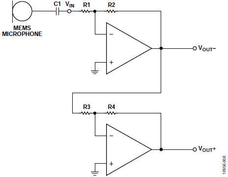 MEMS麥克風(fēng)的單端輸出可用兩個(gè)運(yùn)算放大器和兩個(gè)反相電路級(jí)(見(jiàn)圖8)以簡(jiǎn)單的串聯(lián)結(jié)合轉(zhuǎn)換為一個(gè)差分信號(hào)。每級(jí)的輸出轉(zhuǎn)換為彼此反相,作為差分對(duì)。圖8顯示的電路中信號(hào)的放大發(fā)生在第一級(jí),由R1和R2設(shè)置。電阻R3和R4值應(yīng)相等,為第二級(jí)提供單位增益。為了實(shí)現(xiàn)最佳性能,應(yīng)該采用1%電阻(或更好)來(lái)使兩級(jí)之間的誤差最小化。