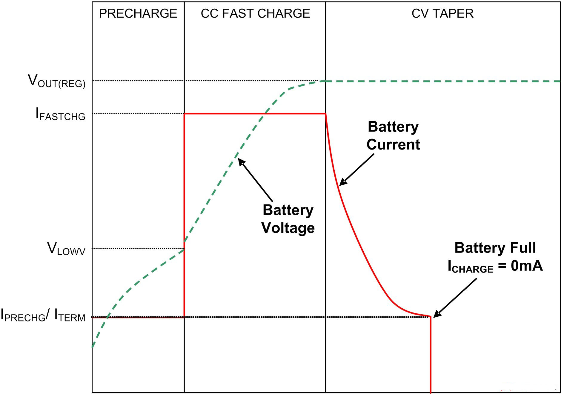鋰離子電池要求專門的充電周期,以實(shí)現(xiàn)安全充電并最大化電池使用時(shí)間。電池充電分兩個(gè)階段:恒定電流 (CC) 和恒定電壓(CV)。電池位于完全充滿電壓以下時(shí),電流經(jīng)過(guò)穩(wěn)壓進(jìn)入電池。在CC模式下,電流經(jīng)過(guò)穩(wěn)壓達(dá)到兩個(gè)值之一。如果電池電壓非常低,則充電電流降低至預(yù)充電電平,以適應(yīng)電池并防止電池?fù)p壞。該閾值因電池化學(xué)屬性而不同,一般取決于電池制造廠商。一旦電池電壓升至預(yù)充電閾值以上,充電便升至快速充電電流電平。典型電池的最大建議快速充電電流為1C(C=1 小時(shí)內(nèi)耗盡電池所需的電流),但該電流也取決地電池制造廠商。典型充電電流為~0.8C,目的是最大化電池使用時(shí)間。對(duì)電池充電時(shí),電壓上升。一旦電池電壓升至穩(wěn)壓電壓(一般為4.2V),充電電流逐漸減少,同時(shí)對(duì)電池電壓進(jìn)行穩(wěn)壓以防止過(guò)充電。在這種模式下,電池充電時(shí)電流逐漸減少,同時(shí)電池阻抗降低。如果電流降至預(yù)定電平(一般為快速充電電流的10%),則終止充電。我們一般不對(duì)電池浮充電,因?yàn)檫@樣會(huì)縮短電池使用壽命。圖1 以圖形方式說(shuō)明了典型的充電周期。