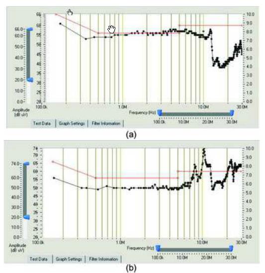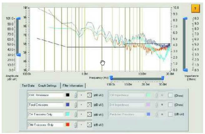 在標(biāo)準(zhǔn)電磁兼容性測試實驗室可得到設(shè)備的總干擾情況,但無法了解設(shè)備的共模干擾和差模干擾特性。為了在測量中分辨共;蛘卟钅8蓴_信號,通用的儀器是很難實現(xiàn)的。使用專用的傳導(dǎo)測試儀,可獲得設(shè)備的總干擾、共模干擾和差模干擾。測試結(jié)果如圖3所示。
