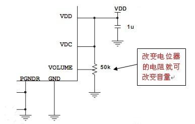 直流音量(DC VOLUME):通過可變電阻(通常是電位器)改變VOLUME端的電壓達(dá)到調(diào)節(jié)音量的目的。