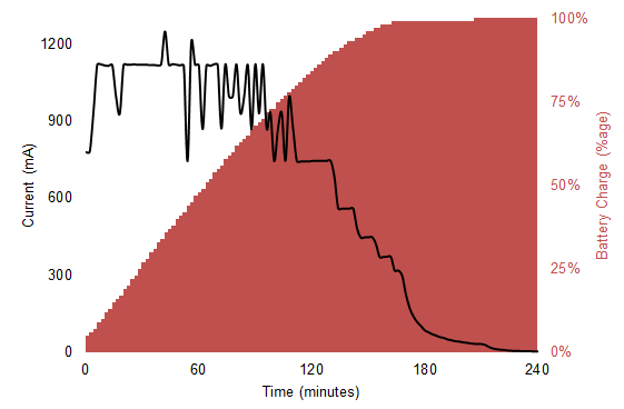 為了展示這一過(guò)程,我們對(duì)三星Galaxy Note手機(jī)進(jìn)行了充電,并測(cè)量了整個(gè)過(guò)程中的電流,而且與對(duì)應(yīng)的電量比例進(jìn)行了對(duì)比。從上圖可以看出,充電初期的電流最高,之后逐漸降低。最后一部分電量的充電時(shí)間很長(zhǎng),原因是控制器在放緩電流,避免電池過(guò)沖。