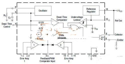 控制信號由集成電路外部輸入,一路送至死區(qū)時間比較器,一路送往誤差放大器的輸入端。死區(qū)時間比較器具有120mV的輸入補償電壓,最小輸出死區(qū)時間約等于鋸齒波周期的4%,即輸出驅(qū)動的最大占空比為96%.當(dāng)把死區(qū)時間控制輸入端接上固定的電壓(范圍在0-3.3V)即能在輸出脈沖上產(chǎn)生附加的死區(qū)時間。脈沖寬度調(diào)制比較器為誤差放大器調(diào)節(jié)輸出脈寬提供了一個手段:當(dāng)反饋電壓從0.5V變化到3.5V時,輸出的脈沖寬度從被死區(qū)確定的最大導(dǎo)通百分比時間下降到零。兩個誤差放大器具有從-0.3V到(Vcc-2.0)的共模輸入范圍,這可從電源的輸出電壓和電流察覺得到。誤差放大器的輸出端常處于高電平,它與脈沖寬度調(diào)制器的反相輸入端進行"或"運算,正是這種電路結(jié)構(gòu),放大器只需最小的輸出即可支配控制回路。