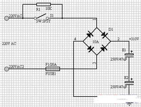 采用全橋整流電路,如下圖6 所示。輸出電流要求最大達到8A,考慮功率損耗和一定的余量,選擇10A 的方橋KBPC3510 和10A 的保險管。整流后的電壓達310V,采用兩個250V/100uF 電容作濾波處理。圖中開關(guān)S1 和電阻R1 并聯(lián)為"軟啟動"部分,此處未作詳細講解,詳細軟啟動設(shè)計見各種開關(guān)電源軟啟動設(shè)計。