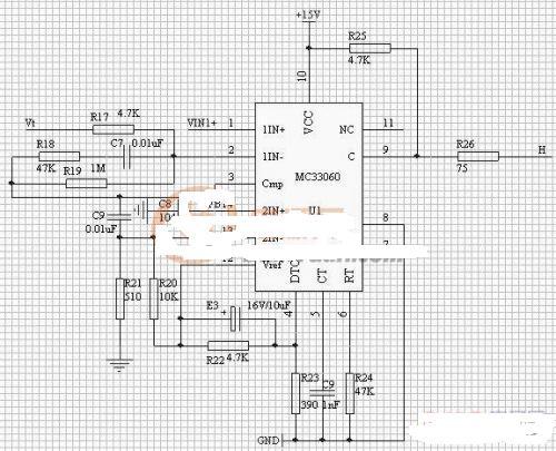 MC33060作為主控芯片控制開關(guān)管的導(dǎo)通與截止,由其內(nèi)部結(jié)構(gòu)功能可知,在MC33060內(nèi)部有一個+5V參考電壓,通常用作兩路比較器的反相參考電壓,設(shè)計中1腳和2腳的比較器用來作為輸出電壓反饋,13腳和14腳的比較器用來檢測開關(guān)管的電流是否過流。電路中2腳通過一個反相電路接參考電壓,降壓輸出反饋經(jīng)一同相電路接MC33060的1腳。當(dāng)電路處于工作狀態(tài)時,1腳和2腳電壓就會相互比較,根據(jù)兩者的差值來調(diào)整輸出波形脈寬,達到控制和穩(wěn)定輸出的目的。