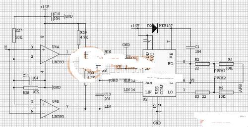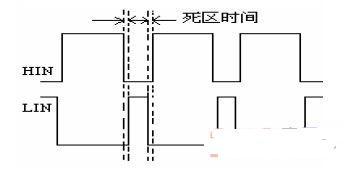 因驅(qū)動雙管,且雙管不能同時導(dǎo)通,控制IC 輸出只有一路信號,則在控制IC 輸出和驅(qū)動之間需加入反相延時電路,將控制IC 輸出的一路PWM 經(jīng)同相和反相比較器后,經(jīng)電阻R29 和R30 的上拉分別對電容C12、C13 充電產(chǎn)生延時,使得兩路PWM 具有對稱互補性且具有一定的死區(qū)間隔,保證主回路中兩開關(guān)管不會同時導(dǎo)通。在電路中HIN 和LIN 標(biāo)號端得到的波形圖如下圖10 所示。