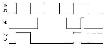 該芯片為而輸出高壓柵極驅(qū)動器,14腳雙列直插,驅(qū)動信號延時為ns 級,開關(guān)頻率可從幾十赫茲到幾百千赫茲。IR2110 具有二路輸入信號和二路輸出信號,其中二路輸出信號中的一路具有電平轉(zhuǎn)換功能,可直接驅(qū)動高壓側(cè)的功率器件。該驅(qū)動器可與主電路共地運行,且只需一路控制電源,克服了常規(guī)驅(qū)動器需要多路隔離電源的缺點,大大簡化了硬件設(shè)計。IR2110 就簡易真值圖如下圖9 所示。