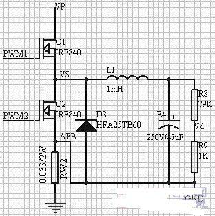 根據(jù)整流后的電壓和輸入電流參數(shù),選擇IRF840 為高頻開關(guān)管,其最大耐壓VDS 為500V,最大能承受的導(dǎo)通電流ID 為8A,滿足設(shè)計要求。工作在高頻工作狀態(tài)的續(xù)流二極管一般選用快恢復(fù)的二極管,此處選擇HFA25TB60,能承受600V 的反向壓降,最大導(dǎo)通電流為25A,且恢復(fù)時間僅為35ns.輸出部分通過兩個電阻分壓至電壓采樣電路,如下圖12 所示。