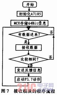 在接收電路中,MCU首先初始化A7105模塊,和存儲(chǔ)64位的地址信息,然后進(jìn)入等待接收狀態(tài)。當(dāng)接收模塊接收到發(fā)送電路發(fā)來的數(shù)據(jù)后,與自己內(nèi)部儲(chǔ)存的64位的地址信息進(jìn)行對(duì)比,若相同,則發(fā)送確認(rèn)信息,并控制P3.7管腳輸出低電平,點(diǎn)亮LED,其主程序流程如圖7所示。