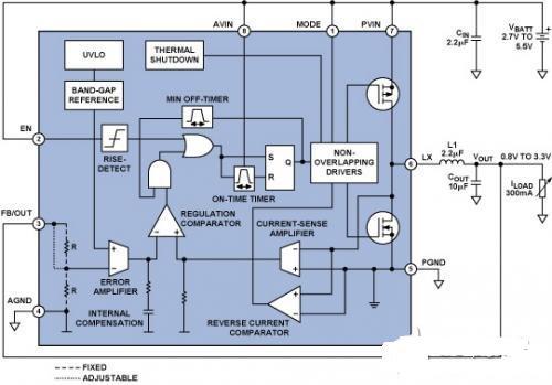 這里將簡單地解釋該電路的工作原理:將DC輸出電壓的分壓與誤差放大器中的內(nèi)部參考源比較,然后將誤差放大器的輸出與電流采樣放大器的輸出比較,以驅(qū)動單穩(wěn)態(tài)觸發(fā)器。單穩(wěn)態(tài)觸發(fā)器在由VOUT/VIN確定的時(shí)間周期內(nèi)處于暫穩(wěn)態(tài)。單穩(wěn)態(tài)觸發(fā)器使上面的門控晶體管導(dǎo)通,電感L1中的電流逐漸變大。當(dāng)單穩(wěn)態(tài)觸發(fā)器的暫穩(wěn)態(tài)結(jié)束時(shí),晶體管截止,電感L1中的電流逐漸變小。在由最小關(guān)斷時(shí)間定時(shí)器和最。“谷值”)電流確定的時(shí)間間隔之后,單穩(wěn)態(tài)觸發(fā)器再次被觸發(fā)。芯片內(nèi)的單穩(wěn)態(tài)觸發(fā)定時(shí)器使用輸入電壓前饋,使得穩(wěn)態(tài)時(shí)保持恒定的頻率。