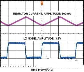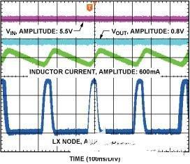圖2示出了不同條件下的典型波形。圖2a示出了在ILOAD=600mA,電壓從VIN=5.5V減小到VOUT=0.8V時(shí)的低占空比。如圖中所示,在3MHz的開關(guān)頻率下,可以獲得45 ns的最小導(dǎo)通時(shí)間。