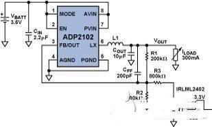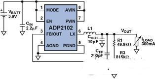 圖1示出了ADI公司ADP2102的典型應(yīng)用電路,這是一款低占空比、3 MHz同步整流降壓轉(zhuǎn)換器。ADP2102具有固定輸出電壓和可調(diào)輸出電壓的多種配置。這里將ADP2102連接成固定輸出電壓配置,由5.5 V的輸入電壓產(chǎn)生300mA、0.8 V輸出電壓。接下來給出輸出電壓可調(diào)的應(yīng)用示例。