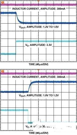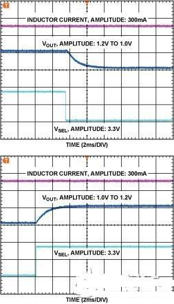 圖4示出了輸出電流IOUT、輸出電壓VOUT和控制電壓VSEL.VSEL為低電平時(shí),輸出電壓為1.0 V,VSEL為高電平時(shí),輸出電壓為1.2 V.