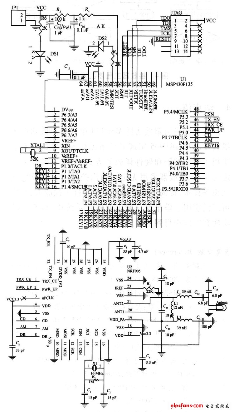 信號發(fā)射電路包括鍵盤、CPU 和數(shù)據(jù)發(fā)射部分,硬件原理,如圖2 所示。塔吊的控制量(上、下,左、右、前、后、低速、中速、高速、急停等)通過鍵盤輸入電路將相應控制信號送入單片機MSP430F135 的I/O口,經(jīng)過單片機處理的信號通過其SP I口輸出到無線芯片nRF905,單片機協(xié)調(diào)整個系統(tǒng)的正常工作,同時對射頻芯片進行設置以確定其工作模式、工作頻率、傳輸速率等參數(shù),輸出信號經(jīng)過無線芯片的處理,送入無線發(fā)射部分發(fā)送至接收方。