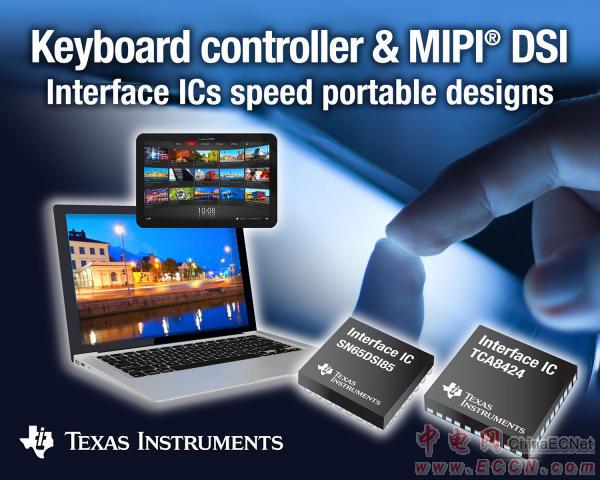 TI宣布推出兩款可幫助平板電腦設計人員簡化設計的全新器件。其中 TCA8424 是業(yè)界首款采用 I2C 128 鍵鍵盤控制器的人機接口器件(HID),無需在生產(chǎn)階段對器件進行編程,可簡化設計,加速產(chǎn)品上市進程。該鍵盤控制器可為基于 Windows® 8 的系統(tǒng)提供連接鍵盤的低成本無縫方案。而 SN65DSI85 則是一款面向 FlatLink™ 接口 IC 的數(shù)字分量串行接口 (DSI),可幫助設計人員以更低成本更便捷地連接圖形處理器與 LCD 面板。SN65DSI85 可在平板電腦、上網(wǎng)本以及移動因特網(wǎng)設備上支持高達 2560 × 1600p 的分辨率。