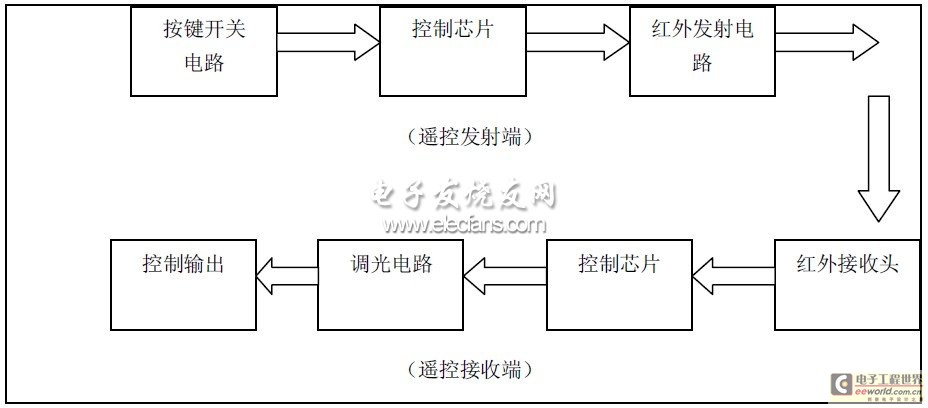 紅外遙控電路由發(fā)射電路和接收電路組成,發(fā)射部分由按鍵開(kāi)關(guān)電路、控制芯片和紅外發(fā)射電路三部分組成。當(dāng)按下遙控按鈕時(shí),單片機(jī)產(chǎn)生相應(yīng)的控制信號(hào),經(jīng)紅外發(fā)射二極管發(fā)射出去。接收部分由紅外接收頭、控制芯片、調(diào)光電路組成,當(dāng)紅外接收器接收到控制脈沖后,經(jīng)單片機(jī)處理,判斷是否對(duì)電燈進(jìn)行調(diào)光或開(kāi)關(guān),根據(jù)需要執(zhí)行相應(yīng)的操作,接收系統(tǒng)采用的是5 伏單電源電壓供電。如下圖所示: