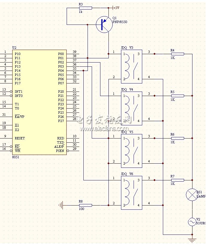 接收電路和調(diào)光電路的實(shí)現(xiàn)均是通過(guò)繼電器實(shí)現(xiàn)的,給每一個(gè)繼電器串聯(lián)一個(gè)電阻,構(gòu)成一個(gè)回路,本電路將四個(gè)繼電器回路并聯(lián),連接在P0 口上,當(dāng)四個(gè)繼電器均閉合時(shí),燈最亮,當(dāng)三個(gè)繼電器工作時(shí),燈較亮,當(dāng)兩個(gè)繼電器工作時(shí)燈次亮,當(dāng)一個(gè)繼電器工作時(shí),燈最暗,當(dāng)四個(gè)繼電器都不工作時(shí),燈泡處于關(guān)閉狀態(tài)。接收電路圖如圖6 所示:
