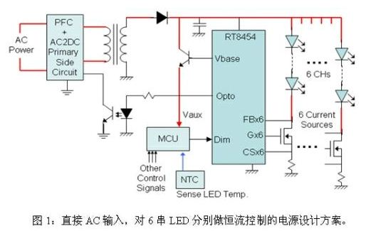 方案一:直接AC輸入,對(duì)6串 LED分別做恒流控制