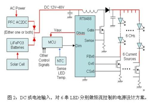 方案二:DC或電池輸入,對(duì)6串LED分別做恒流控制